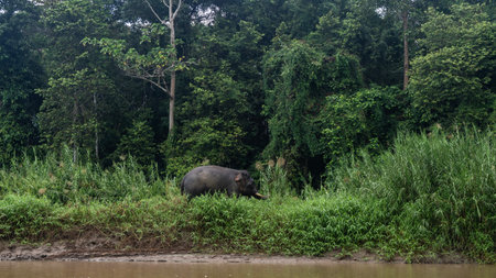 The pygmy elephant is trying to get out of the river. The animal climbs onto a clay bank. View from the back. Tall, lush green grass on the riverbank. Rain forest trees
