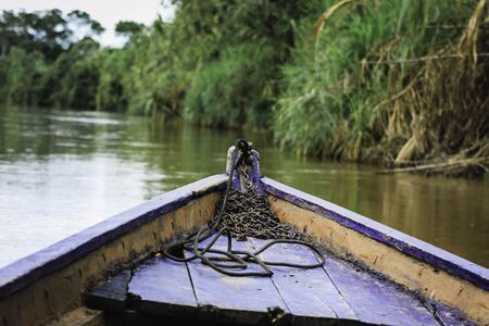 Part of boat on river in the jungle of Peru. There are plants on the side of river and the boat is colorful.