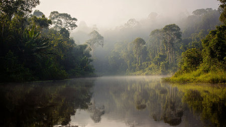 A lush rainforest embraces a winding river under a blanket of fog during early morning.