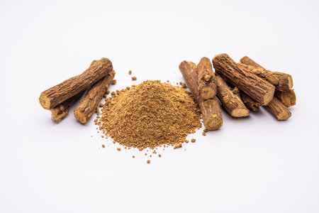 Ayurvedic Mulethi or Liquorice root stick or jeshthamadh powder served in a bowl over moody background