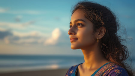 A young woman gazes thoughtfully at the sunset over the ocean while standing on the beach, embracing the moment during a summer evening