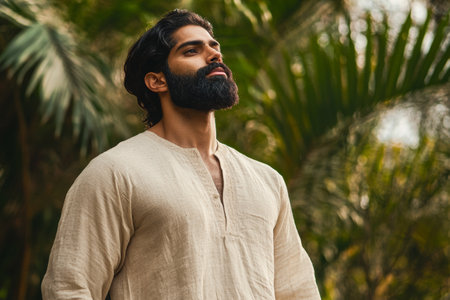 Promoting eco-friendly culture with an Indian model in traditional khadi shirt amidst greenery in vibrant natural setting