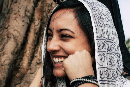 Hampi Karnataka India December 21, 2018 Portrait of Reachel Singh, Dutch professional singer taking inspiration in the nature at Hampi in southern India