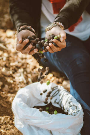 sustainable living conceptual still-life, Reduce plastic use message with wooden peg on top of plastic bags
