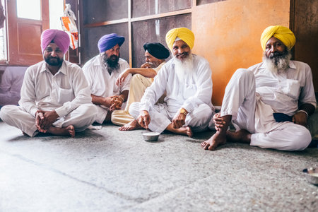 Amritsar, India - August 15, 2016: Sikhs men siting in the free canteen in Golden Temple, Amritsar, India