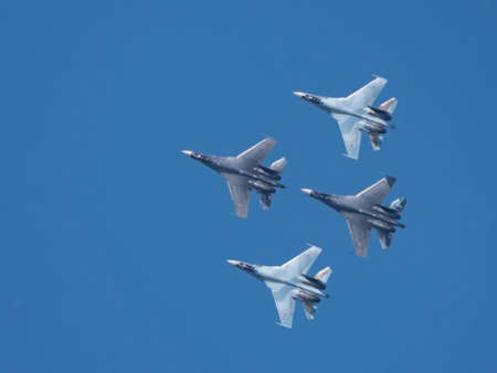 SAINT PETERSBURG, RUSSIA - April, 25, 2015: Flying display and aerobatic show of Russian Knights (Russkie Vityazi) Su-27