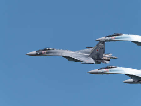 Zhukovsky, Russia-July 23, 2021: MAKS-2021 International Air Show, an exhibition of aircraft and helicopters. Modern Russian fighter jets in the sky.