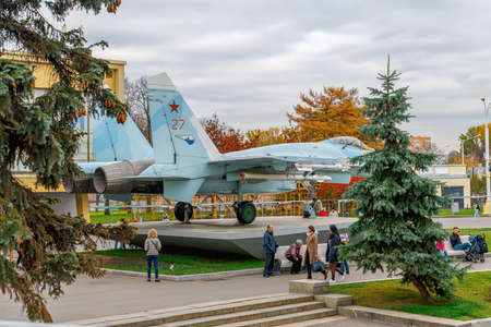 Russia, Moscow, October 2019. Model of the military aircraft of the SU-27 fighter at VDNH. A popular tourist attraction.