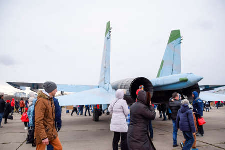 Krasnodar, Russia - February 23, 2017: Military aircraft fighters and other aircraft at the Krasnodar airfield. Exhibition of military equipment in honor of the defender of the fatherland. Festive event. People inspect military equipment.