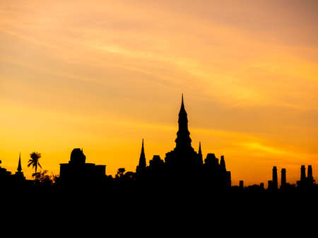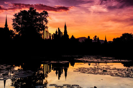 Amazing scenetic of silhouette of pagoda, temple and gold sunset sky in Sukhothai Historical Park