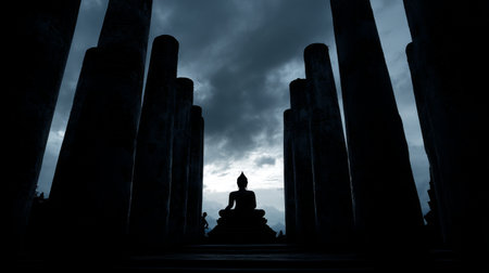 A serene silhouette of a Buddha statue stands amidst ancient columns, set against a dramatic sky, evoking peace and reflection in this tranquil outdoor scene.
