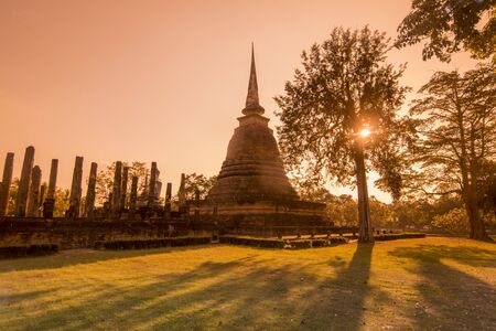 The ruins of the Buddhist temple Wat Chana Songkram against the backdrop of an outgoing sunset. The historical park of the city of Sukhothai. Thailand