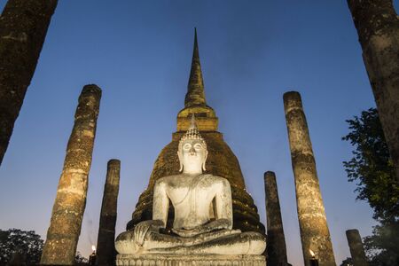 Amazing scenetic of silhouette of Wat Mahathat Temple in the precinct of Sukhothai Historical Park with big buddha statue on blue sunset sky background, a UNESCO World Heritage Site in Thailand.