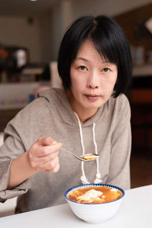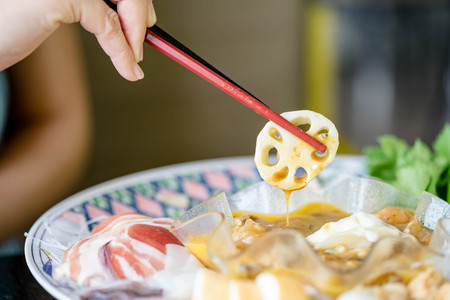 young asian woman enjoy eating Shabu-Shabu japanese hot pot