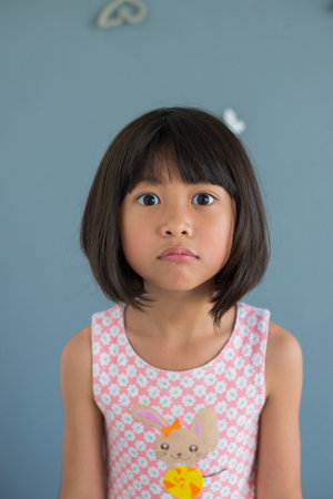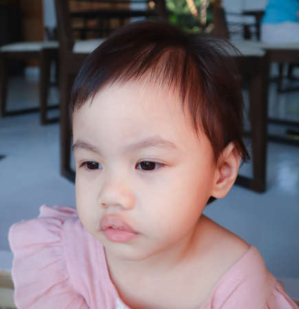 Dramatic portrait of 3 years old cute baby Asian girl, little toddler child with adorable short hair standing with worried expression at home looking at copy space.