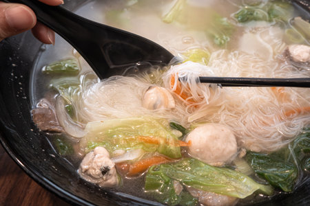 A bowl of Taiwanese rice noodles with mixed seafood and vegetables in clear savory broth.