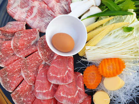 Top view of Fresh beef raw with vegetable and egg for Sukiyaki Japanese food shabu shabu.