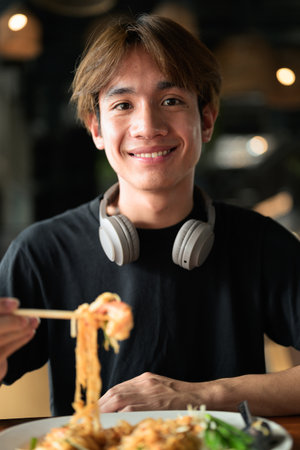 Pad Thai noodles eaten with chopsticks in Thailand by young tourist man during day. Famous street food cuisine loved by tourist and locals in Asia.