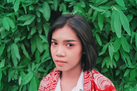 asia thai teen short hair White t-shirt beautiful girl smile and relax