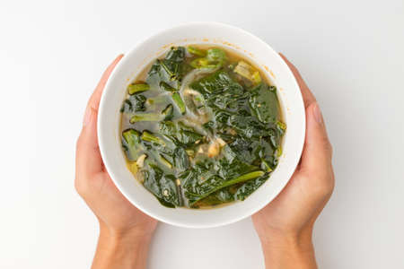 Asian food culture. Miso soup with vegetables. Cooking broth with vegetables