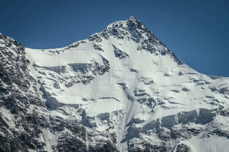 Minimalist sunny mountain landscape with snow-covered mountain top in golden sunshine in clear blue sky. Minimal alpine scenery with high snowy pinnacle in sunlight. Snow on sharp rocks on pointy peak