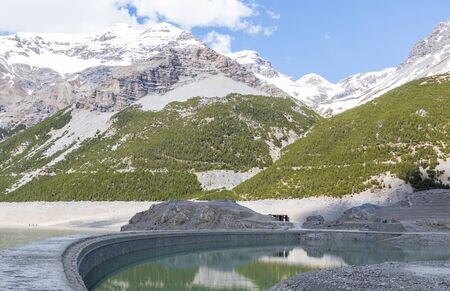 boy with an athletic figure standing over the drained Finstertal dam near the village of Kuhtai in western Austria, near famous Innsbruck. View of mountains Sulzkogel, Gamskogel