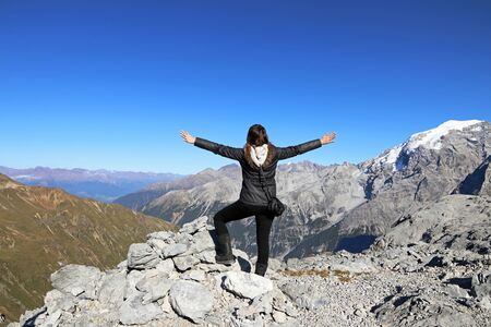 A woman in the mountains stretches out of her arms in joy. Fun in mountaineering