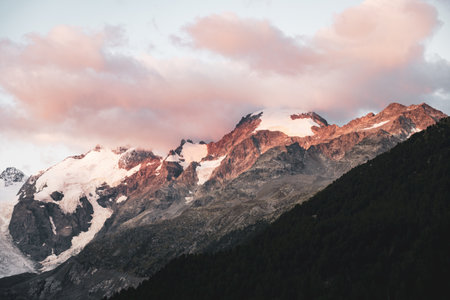 The stunning Piz Bernina rises majestically in the early morning light, showcasing its snow-covered peaks and glaciers against a backdrop of soft, pink clouds.