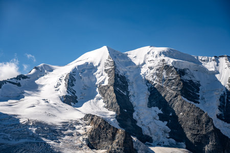 Piz Palu towers in the Swiss Alps, showcasing its rugged glaciers and stunning peaks against a clear blue sky. This breathtaking landscape offers a glimpse into alpine beauty and adventure.