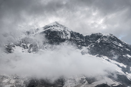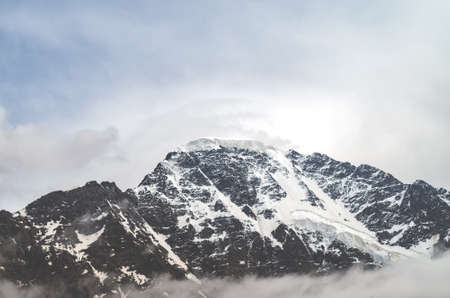 Atmospheric mountains landscape with big snowy mountain top with snow cornices in low clouds. Awesome minimal scenery with snow-white high pinnacle in overcast weather. Giant mountain wall in clouds.