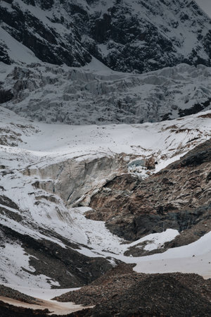 Chalaadi glacier close up in Svaneti mountains, Georgia, cloudy weather
