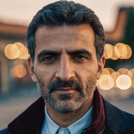 A middle-aged Armenian man stands confidently, his intense gaze capturing the charm of a lively street filled with glowing lights and a vibrant atmosphere during twilight.