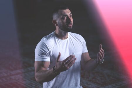 Attractive Man Making Traditional Prayer to God Allah in the Mosque