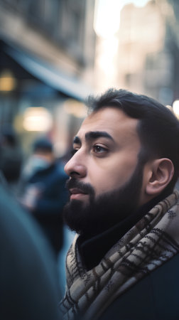 An Armenian man stands confidently in a lively urban setting, exuding charisma.