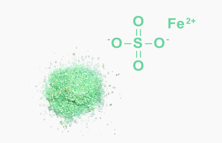 Ferrous Sulfate with chemical structure, a medicine used to treat and prevent iron deficiency anaemia.