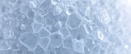 Ice chips scattered across a smooth surface with minimal lighting. Copy space