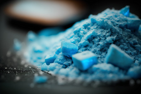 Close up of a pile of blue sugar powder on black background.
