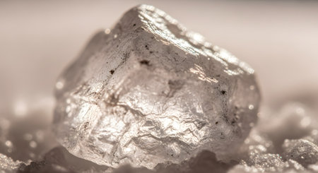 An extreme macro photograph of a single translucent crystal, likely a grain of salt or sugar. The crystal's rough, geometric texture is highly detailed and sparkles in the light.