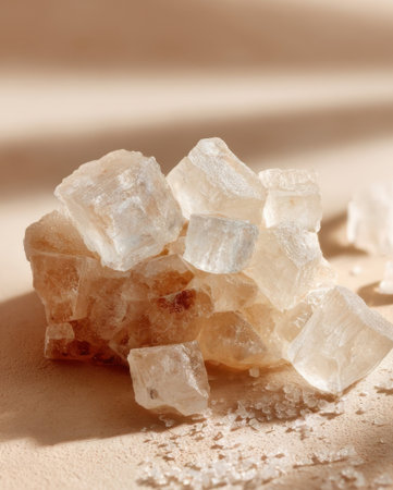 Sugar cubes are placed on a light surface. Some cubes are clear, while others have a light hue. Shadows are formed by natural light in the surrounding area.