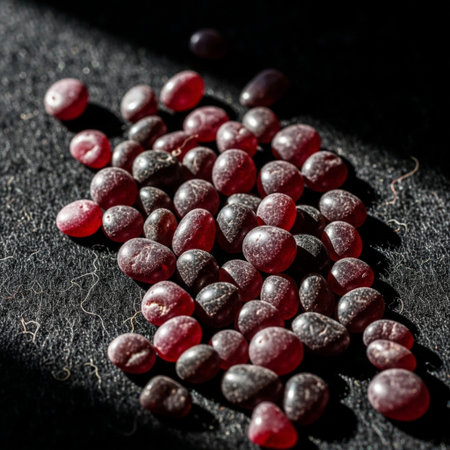 Cinematic low angle macro of spilled ruby and garnet gemstones on dark felt, under harsh sunlight.