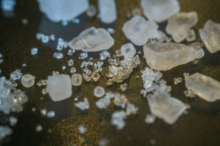 Sugar crystals on black background. Crystals of sugar are scattered on the floor.