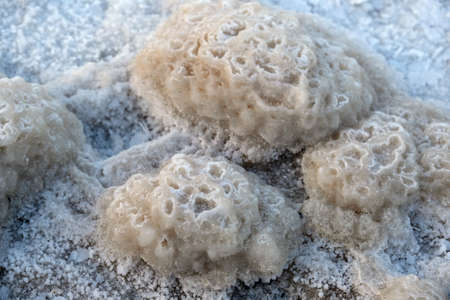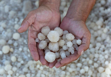 Crystallized Dead Sea-salt of men's palms. Male hands with pile of salt crystals. Blurred background of Dead Sea shore surface. Extraction of salt by hand. Useful minerals.Treatment of Jordanian salt.