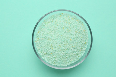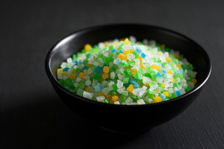 Blue salt minerals in a Petri dish on a ruberoid grain surface. Black textured background. Blue salty crystals in chemical flat glassware. Natural sea salt granules for cooking and bathing.