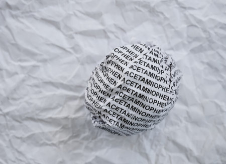 Crumpled paper ball with words Acetaminophen on crumpled white paper background.
