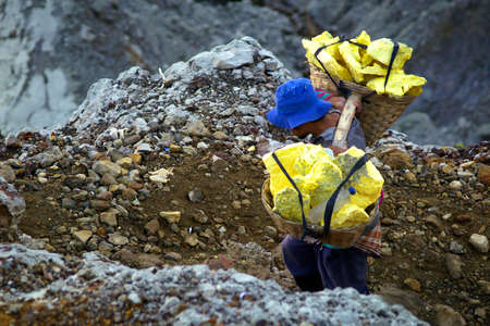 BASKET OF SULFUR ON KAWAH IJEN VOLCANO IN JAVA ISLAND-INDONESIA