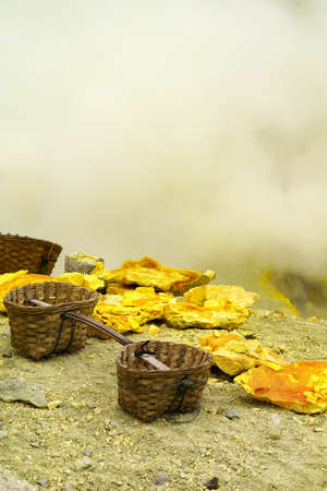 yellow sulfur inside woven bamboo basket at volcanic crater Kawah Ijen