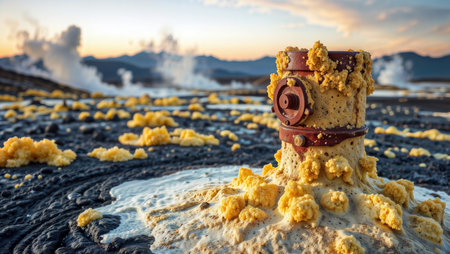 Sulphur Hot Spring. A hot spring pipe covered with yellow sulphur in a geothermal area.