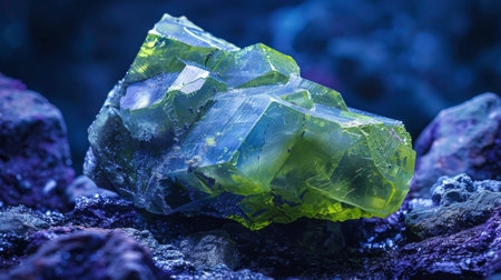 Bright Green Transparent Crystal Resting on Dark Textured Surface With Blue Light Illuminating Surroundings. Generative AI