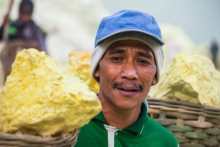 Ijen Volcano, Indonesia - April 1, 2018: Workers mine sulfur from the crater of the volcano