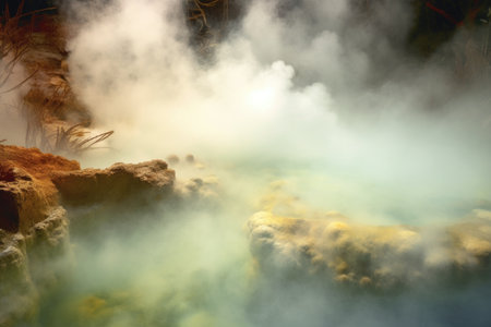 close-up of steam rising from a hot spring, created with generative ai